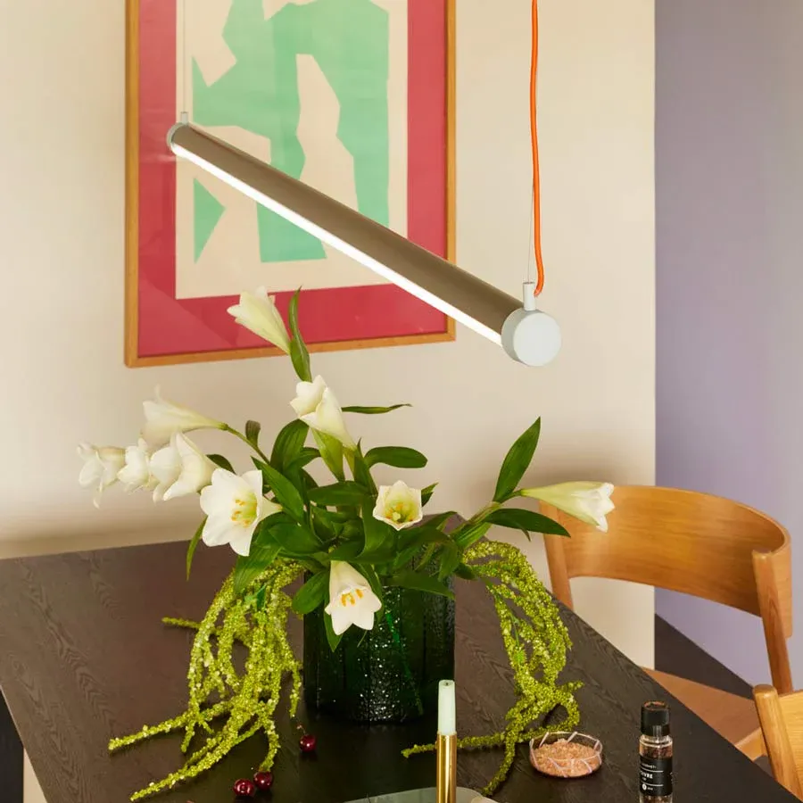 Grâce à sa suspension discrète et son câble coloré, elle crée une impression de flottement, comme un trait de lumière suspendu dans les airs. Parfaite pour structurer visuellement une pièce sans l’alourdir, elle apporte une touche contemporaine et sophistiquée à votre intérieur.